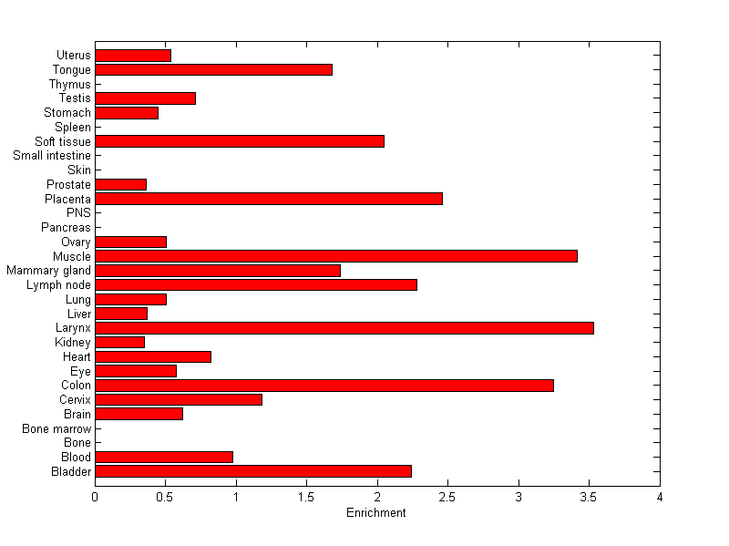 The expression level is normalized with tissue-library size. Each value for a gene in a tissue is a ratio of observed ESTs to the expected one in this tissue. The expected number of ESTs is the product of total ESTs of the gene and the fraction of total ESTs in the tissue among all ESTs in 30 tissues.