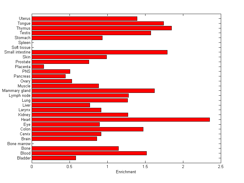The expression level is normalized with tissue-library size. Each value for a gene in a tissue is a ratio of observed ESTs to the expected one in this tissue. The expected number of ESTs is the product of total ESTs of the gene and the fraction of total ESTs in the tissue among all ESTs in 30 tissues.