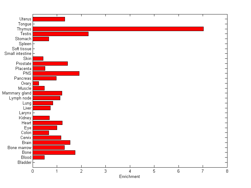 The expression level is normalized with tissue-library size. Each value for a gene in a tissue is a ratio of observed ESTs to the expected one in this tissue. The expected number of ESTs is the product of total ESTs of the gene and the fraction of total ESTs in the tissue among all ESTs in 30 tissues.