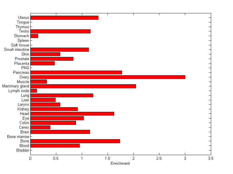 The expression level is normalized with tissue-library size. Each value for a gene in a tissue is a ratio of observed ESTs to the expected one in this tissue. The expected number of ESTs is the product of total ESTs of the gene and the fraction of total ESTs in the tissue among all ESTs in 30 tissues.