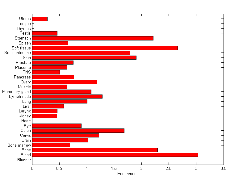 The expression level is normalized with tissue-library size. Each value for a gene in a tissue is a ratio of observed ESTs to the expected one in this tissue. The expected number of ESTs is the product of total ESTs of the gene and the fraction of total ESTs in the tissue among all ESTs in 30 tissues.