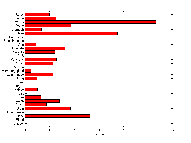 The expression level is normalized with tissue-library size. Each value for a gene in a tissue is a ratio of observed ESTs to the expected one in this tissue. The expected number of ESTs is the product of total ESTs of the gene and the fraction of total ESTs in the tissue among all ESTs in 30 tissues.