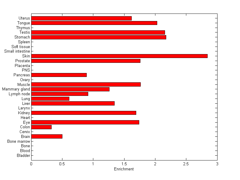 The expression level is normalized with tissue-library size. Each value for a gene in a tissue is a ratio of observed ESTs to the expected one in this tissue. The expected number of ESTs is the product of total ESTs of the gene and the fraction of total ESTs in the tissue among all ESTs in 30 tissues.