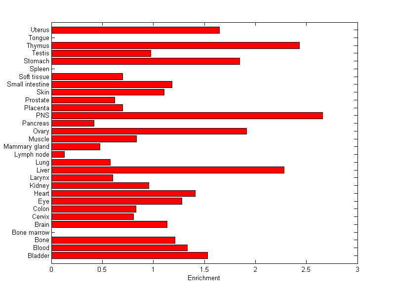The expression level is normalized with tissue-library size. Each value for a gene in a tissue is a ratio of observed ESTs to the expected one in this tissue. The expected number of ESTs is the product of total ESTs of the gene and the fraction of total ESTs in the tissue among all ESTs in 30 tissues.