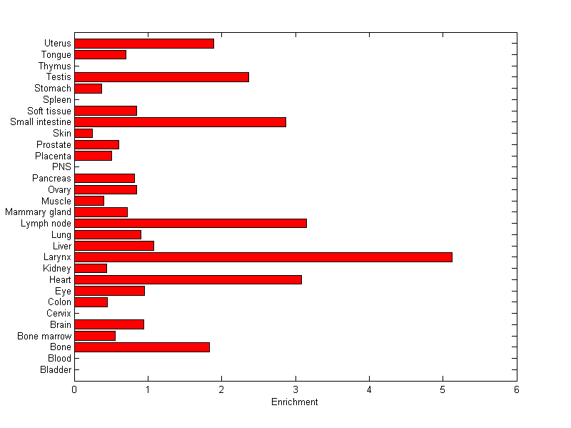The expression level is normalized with tissue-library size. Each value for a gene in a tissue is a ratio of observed ESTs to the expected one in this tissue. The expected number of ESTs is the product of total ESTs of the gene and the fraction of total ESTs in the tissue among all ESTs in 30 tissues.