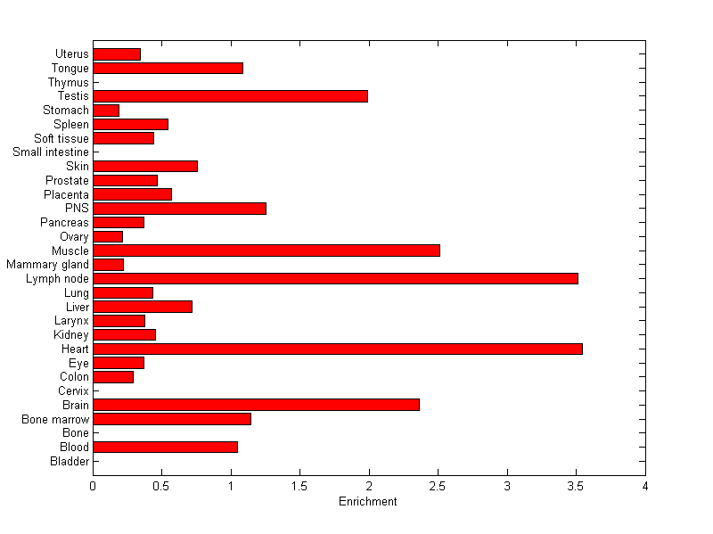 The expression level is normalized with tissue-library size. Each value for a gene in a tissue is a ratio of observed ESTs to the expected one in this tissue. The expected number of ESTs is the product of total ESTs of the gene and the fraction of total ESTs in the tissue among all ESTs in 30 tissues.