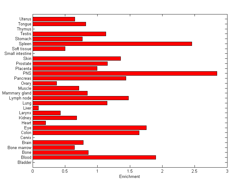 The expression level is normalized with tissue-library size. Each value for a gene in a tissue is a ratio of observed ESTs to the expected one in this tissue. The expected number of ESTs is the product of total ESTs of the gene and the fraction of total ESTs in the tissue among all ESTs in 30 tissues.