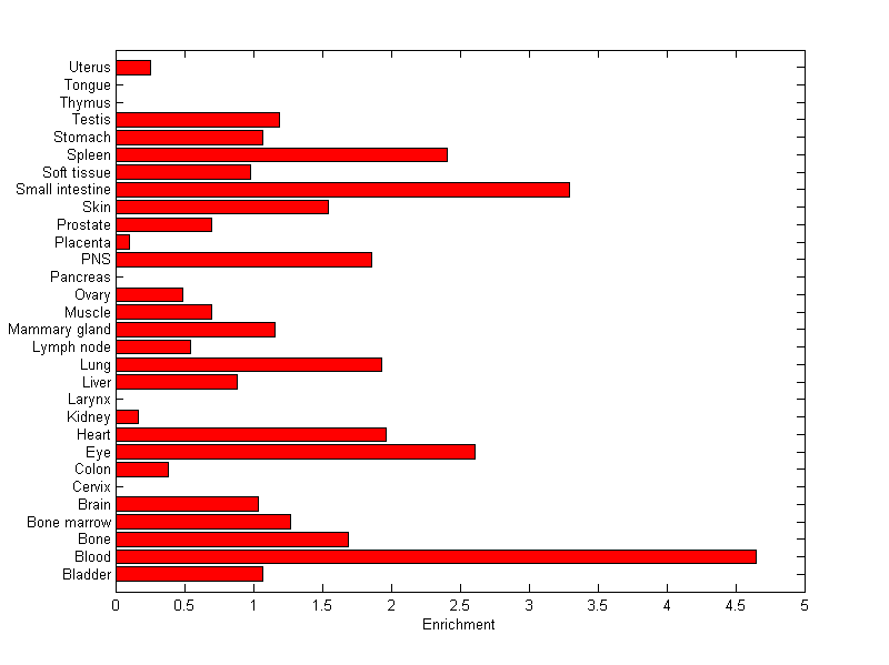 The expression level is normalized with tissue-library size. Each value for a gene in a tissue is a ratio of observed ESTs to the expected one in this tissue. The expected number of ESTs is the product of total ESTs of the gene and the fraction of total ESTs in the tissue among all ESTs in 30 tissues.