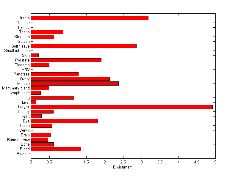 The expression level is normalized with tissue-library size. Each value for a gene in a tissue is a ratio of observed ESTs to the expected one in this tissue. The expected number of ESTs is the product of total ESTs of the gene and the fraction of total ESTs in the tissue among all ESTs in 30 tissues.