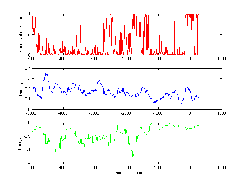 The energy profile (green curve) is about energy for module detection based on TF interaction. The positions with energy less than -1 indicate the existence of CRMs.