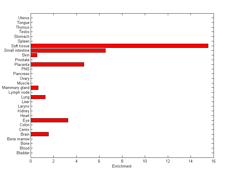 The expression level is normalized with tissue-library size. Each value for a gene in a tissue is a ratio of observed ESTs to the expected one in this tissue. The expected number of ESTs is the product of total ESTs of the gene and the fraction of total ESTs in the tissue among all ESTs in 30 tissues.