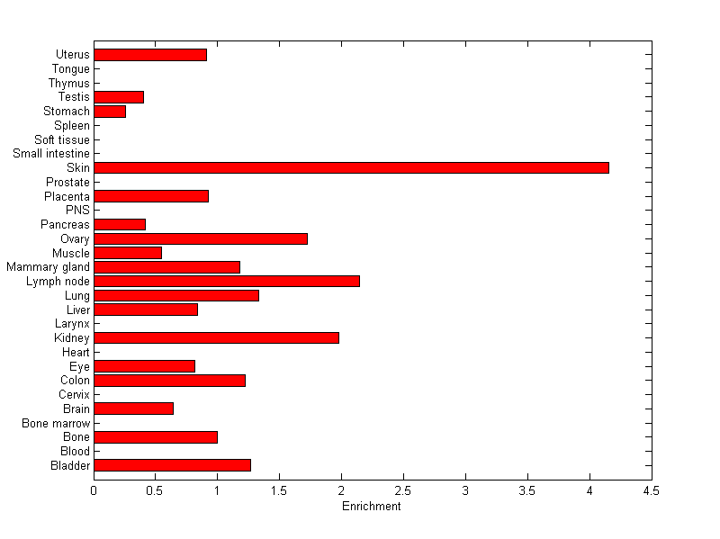 The expression level is normalized with tissue-library size. Each value for a gene in a tissue is a ratio of observed ESTs to the expected one in this tissue. The expected number of ESTs is the product of total ESTs of the gene and the fraction of total ESTs in the tissue among all ESTs in 30 tissues.