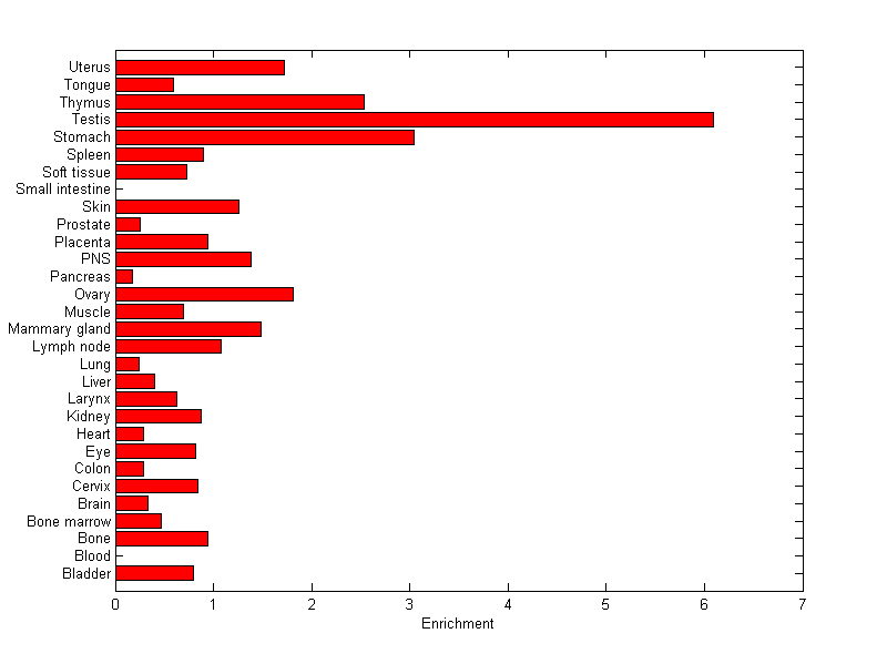 The expression level is normalized with tissue-library size. Each value for a gene in a tissue is a ratio of observed ESTs to the expected one in this tissue. The expected number of ESTs is the product of total ESTs of the gene and the fraction of total ESTs in the tissue among all ESTs in 30 tissues.