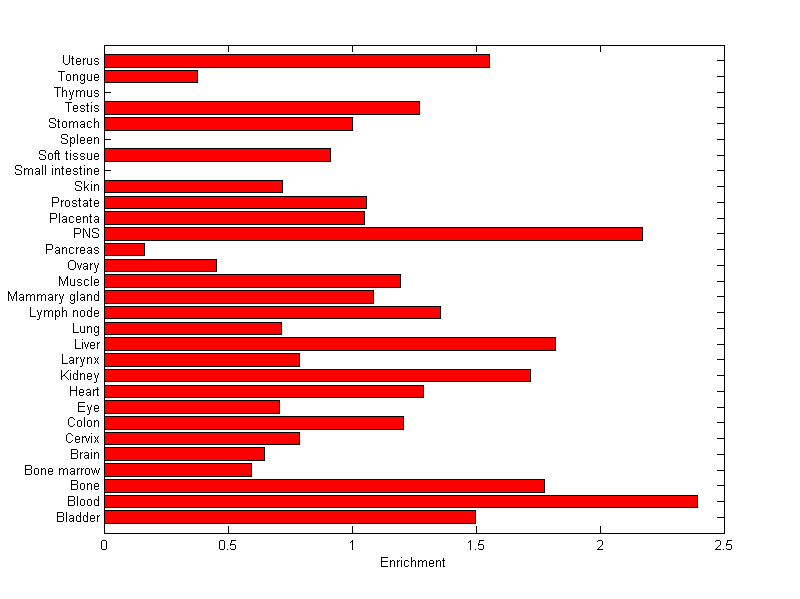 The expression level is normalized with tissue-library size. Each value for a gene in a tissue is a ratio of observed ESTs to the expected one in this tissue. The expected number of ESTs is the product of total ESTs of the gene and the fraction of total ESTs in the tissue among all ESTs in 30 tissues.