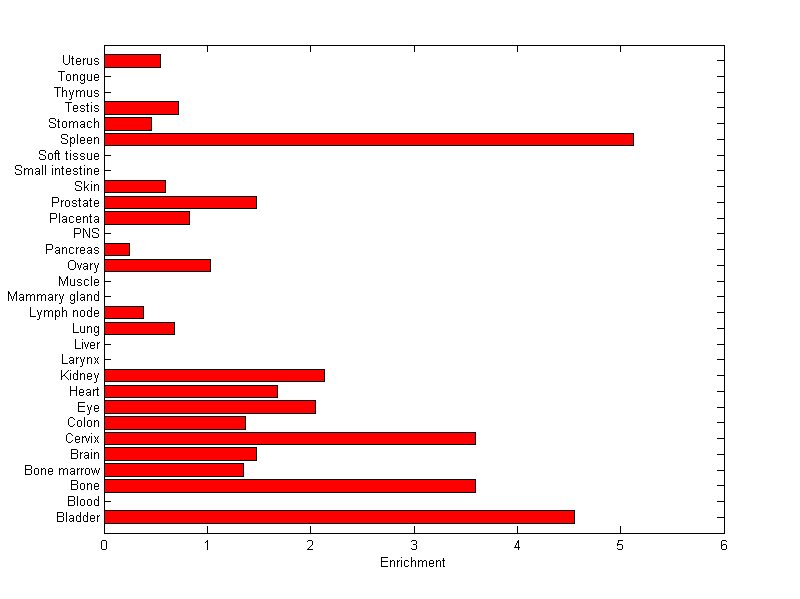 The expression level is normalized with tissue-library size. Each value for a gene in a tissue is a ratio of observed ESTs to the expected one in this tissue. The expected number of ESTs is the product of total ESTs of the gene and the fraction of total ESTs in the tissue among all ESTs in 30 tissues.