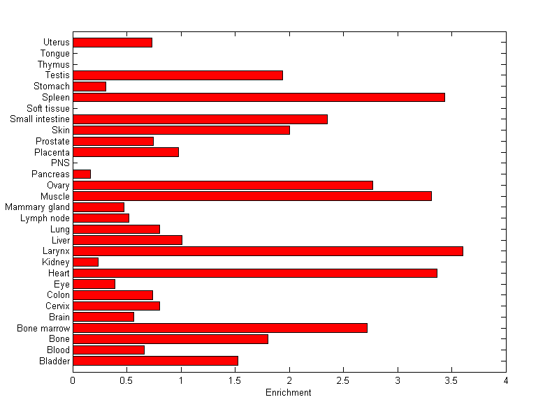 The expression level is normalized with tissue-library size. Each value for a gene in a tissue is a ratio of observed ESTs to the expected one in this tissue. The expected number of ESTs is the product of total ESTs of the gene and the fraction of total ESTs in the tissue among all ESTs in 30 tissues.