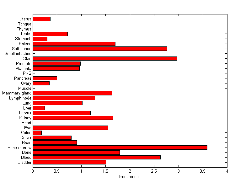The expression level is normalized with tissue-library size. Each value for a gene in a tissue is a ratio of observed ESTs to the expected one in this tissue. The expected number of ESTs is the product of total ESTs of the gene and the fraction of total ESTs in the tissue among all ESTs in 30 tissues.