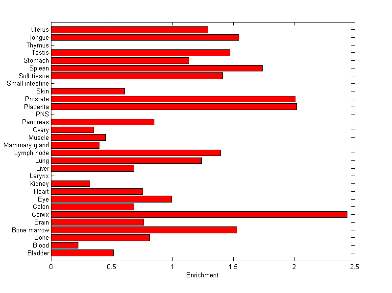 The expression level is normalized with tissue-library size. Each value for a gene in a tissue is a ratio of observed ESTs to the expected one in this tissue. The expected number of ESTs is the product of total ESTs of the gene and the fraction of total ESTs in the tissue among all ESTs in 30 tissues.