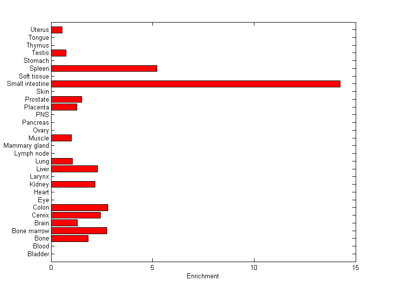 The expression level is normalized with tissue-library size. Each value for a gene in a tissue is a ratio of observed ESTs to the expected one in this tissue. The expected number of ESTs is the product of total ESTs of the gene and the fraction of total ESTs in the tissue among all ESTs in 30 tissues.