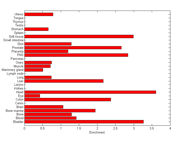 The expression level is normalized with tissue-library size. Each value for a gene in a tissue is a ratio of observed ESTs to the expected one in this tissue. The expected number of ESTs is the product of total ESTs of the gene and the fraction of total ESTs in the tissue among all ESTs in 30 tissues.