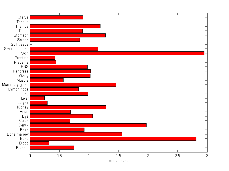 The expression level is normalized with tissue-library size. Each value for a gene in a tissue is a ratio of observed ESTs to the expected one in this tissue. The expected number of ESTs is the product of total ESTs of the gene and the fraction of total ESTs in the tissue among all ESTs in 30 tissues.