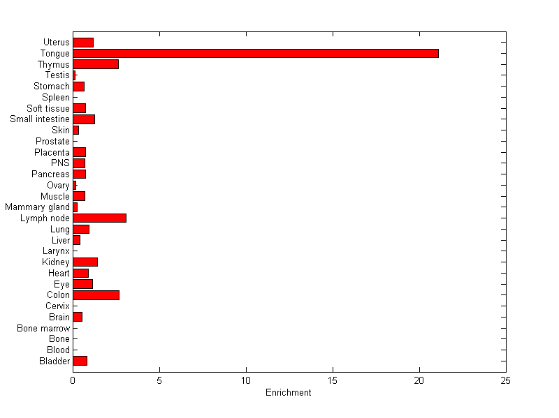The expression level is normalized with tissue-library size. Each value for a gene in a tissue is a ratio of observed ESTs to the expected one in this tissue. The expected number of ESTs is the product of total ESTs of the gene and the fraction of total ESTs in the tissue among all ESTs in 30 tissues.