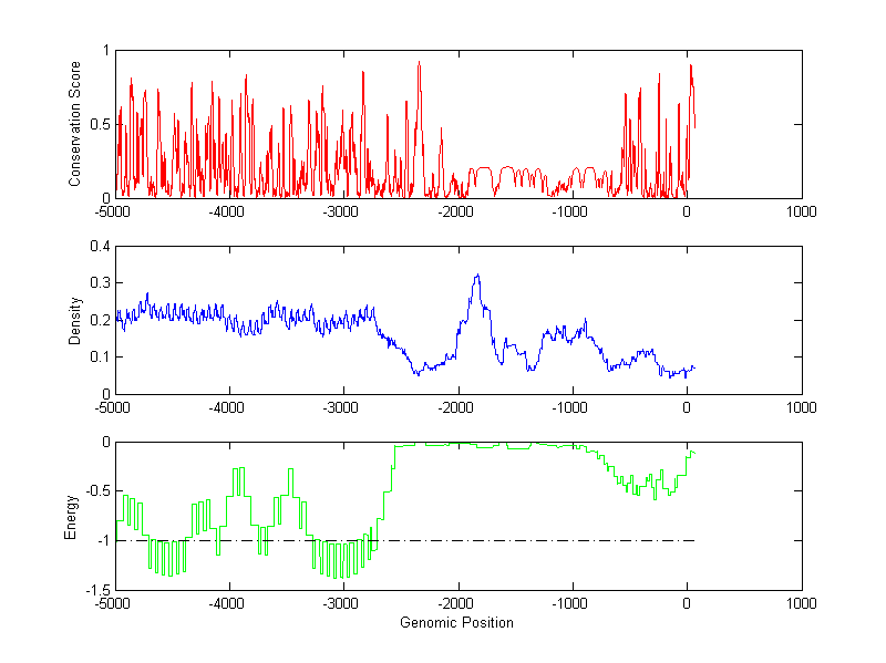 The energy profile (green curve) is about energy for module detection based on TF interaction. The positions with energy less than -1 indicate the existence of CRMs.