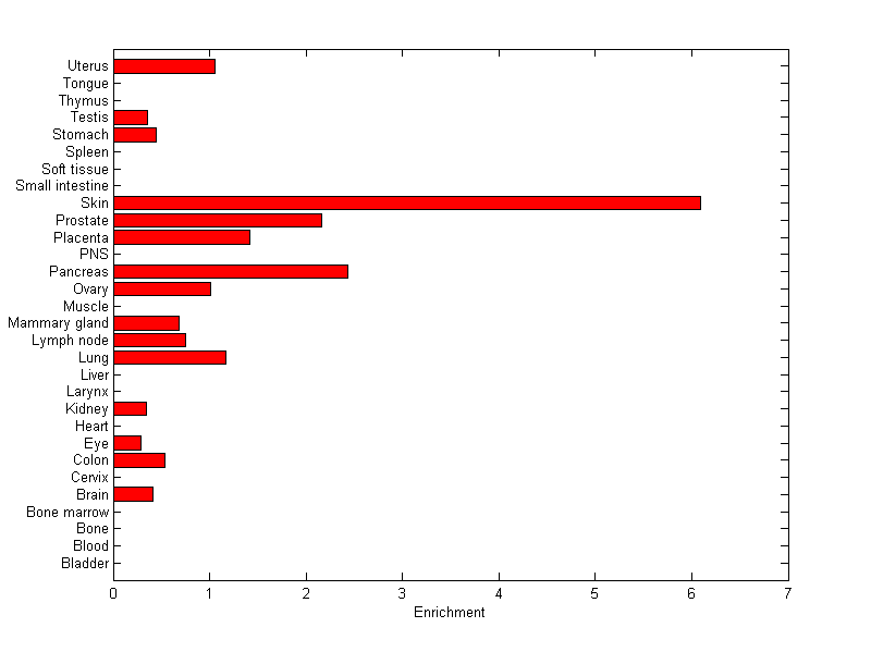 The expression level is normalized with tissue-library size. Each value for a gene in a tissue is a ratio of observed ESTs to the expected one in this tissue. The expected number of ESTs is the product of total ESTs of the gene and the fraction of total ESTs in the tissue among all ESTs in 30 tissues.