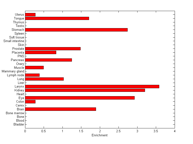The expression level is normalized with tissue-library size. Each value for a gene in a tissue is a ratio of observed ESTs to the expected one in this tissue. The expected number of ESTs is the product of total ESTs of the gene and the fraction of total ESTs in the tissue among all ESTs in 30 tissues.