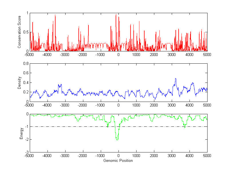About the profiles: The conservation profile (red curve) is about conservation scores of the promoter sequences. Conservation was determined from an eight-way alignment of human, chimpanzee, dog, mouse, rat, chicken, zebrafish and fugu sequences. The conservation was quantified by a conservation score between 0 and 1, with 1 as highest conservation. The conservation score was obtained from UCSC genome databases. The density profile (blue curve) is about density of all TF binding sites. The energy profile (green curve) is about energy for module detection based on TF interaction. The positions with energy less than -1 indicate the existence of CRMs. Download: Conservation profileDensity profile Energy profile CRM summary |