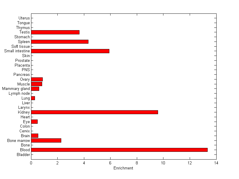 About the profile: The expression level is normalized with tissue-library size. Each value for a gene in a tissue is a ratio of observed ESTs to the expected one in this tissue. The expected number of ESTs is the product of total ESTs of the gene and the fraction of total ESTs in the tissue among all ESTs in 30 tissues. Summary: This gene is preferentially expressed in [blood, kidney] Download: |
