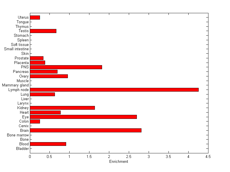 The expression level is normalized with tissue-library size. Each value for a gene in a tissue is a ratio of observed ESTs to the expected one in this tissue. The expected number of ESTs is the product of total ESTs of the gene and the fraction of total ESTs in the tissue among all ESTs in 30 tissues.