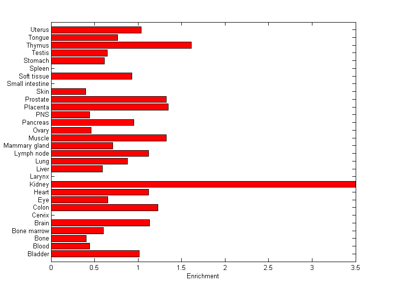The expression level is normalized with tissue-library size. Each value for a gene in a tissue is a ratio of observed ESTs to the expected one in this tissue. The expected number of ESTs is the product of total ESTs of the gene and the fraction of total ESTs in the tissue among all ESTs in 30 tissues.