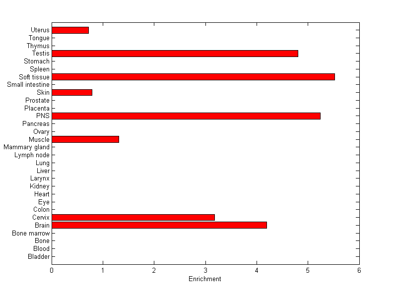 The expression level is normalized with tissue-library size. Each value for a gene in a tissue is a ratio of observed ESTs to the expected one in this tissue. The expected number of ESTs is the product of total ESTs of the gene and the fraction of total ESTs in the tissue among all ESTs in 30 tissues.