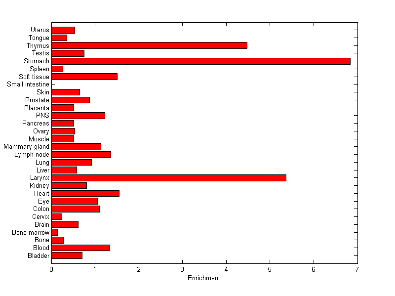About the profile: The expression level is normalized with tissue-library size. Each value for a gene in a tissue is a ratio of observed ESTs to the expected one in this tissue. The expected number of ESTs is the product of total ESTs of the gene and the fraction of total ESTs in the tissue among all ESTs in 30 tissues. Summary: This gene is preferentially expressed in [larynx, stomach] Download: |