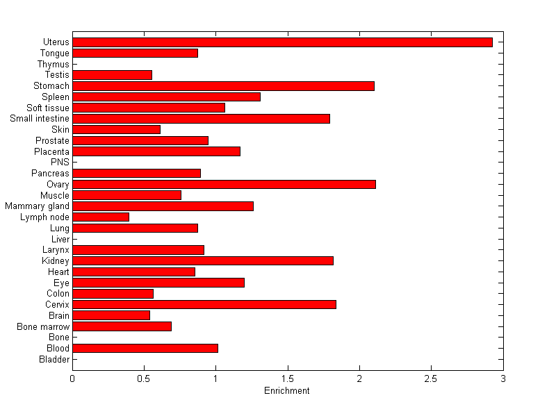 The expression level is normalized with tissue-library size. Each value for a gene in a tissue is a ratio of observed ESTs to the expected one in this tissue. The expected number of ESTs is the product of total ESTs of the gene and the fraction of total ESTs in the tissue among all ESTs in 30 tissues.