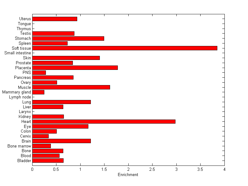 The expression level is normalized with tissue-library size. Each value for a gene in a tissue is a ratio of observed ESTs to the expected one in this tissue. The expected number of ESTs is the product of total ESTs of the gene and the fraction of total ESTs in the tissue among all ESTs in 30 tissues.