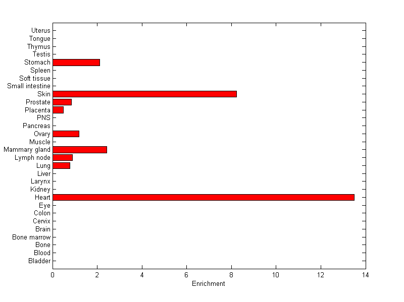 About the profile: The expression level is normalized with tissue-library size. Each value for a gene in a tissue is a ratio of observed ESTs to the expected one in this tissue. The expected number of ESTs is the product of total ESTs of the gene and the fraction of total ESTs in the tissue among all ESTs in 30 tissues. Summary: This gene is preferentially expressed in [heart, skin] Download: |