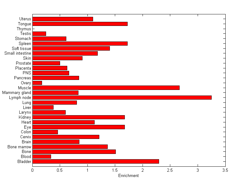 The expression level is normalized with tissue-library size. Each value for a gene in a tissue is a ratio of observed ESTs to the expected one in this tissue. The expected number of ESTs is the product of total ESTs of the gene and the fraction of total ESTs in the tissue among all ESTs in 30 tissues.