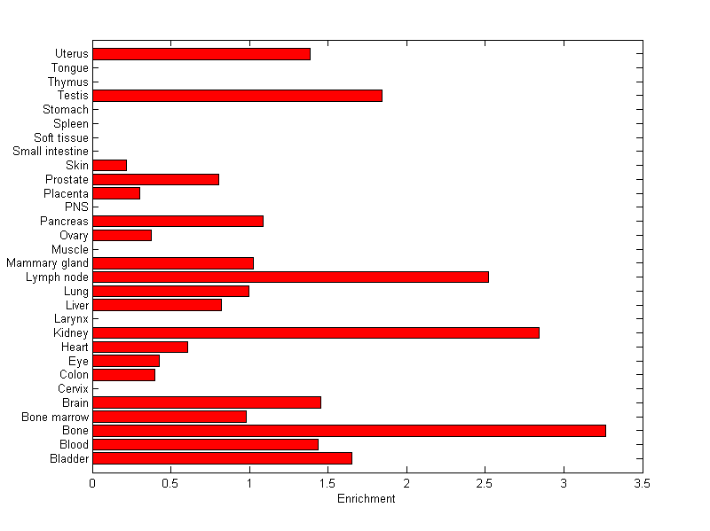 The expression level is normalized with tissue-library size. Each value for a gene in a tissue is a ratio of observed ESTs to the expected one in this tissue. The expected number of ESTs is the product of total ESTs of the gene and the fraction of total ESTs in the tissue among all ESTs in 30 tissues.