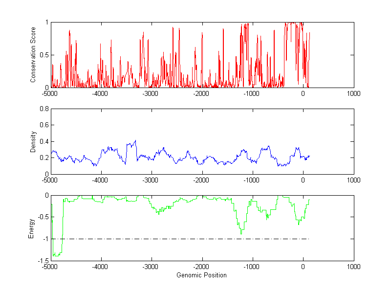 The conservation profile (red curve) is about conservation scores of the promoter sequences. Conservation was determined from an eight-way alignment of human, chimpanzee, dog, mouse, rat, chicken, zebrafish and fugu sequences. The conservation was quantified by a conservation score between 0 and 1, with 1 as highest conservation. The conservation score was obtained from UCSC genome databases.
