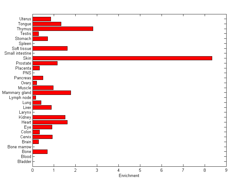 The expression level is normalized with tissue-library size. Each value for a gene in a tissue is a ratio of observed ESTs to the expected one in this tissue. The expected number of ESTs is the product of total ESTs of the gene and the fraction of total ESTs in the tissue among all ESTs in 30 tissues.