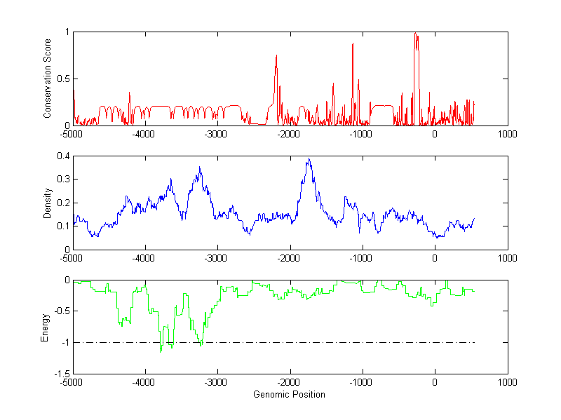 About the profiles: The conservation profile (red curve) is about conservation scores of the promoter sequences. Conservation was determined from an eight-way alignment of human, chimpanzee, dog, mouse, rat, chicken, zebrafish and fugu sequences. The conservation was quantified by a conservation score between 0 and 1, with 1 as highest conservation. The conservation score was obtained from UCSC genome databases. The density profile (blue curve) is about density of all TF binding sites. The energy profile (green curve) is about energy for module detection based on TF interaction. The positions with energy less than -1 indicate the existence of CRMs. Download: Conservation profileDensity profile Energy profile CRM summary |