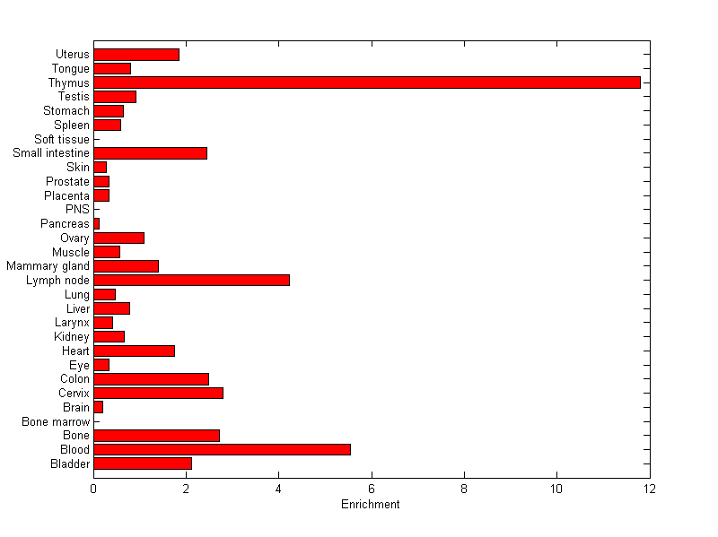 About the profile: The expression level is normalized with tissue-library size. Each value for a gene in a tissue is a ratio of observed ESTs to the expected one in this tissue. The expected number of ESTs is the product of total ESTs of the gene and the fraction of total ESTs in the tissue among all ESTs in 30 tissues. Summary: This gene is preferentially expressed in [blood, thymus] Download: |