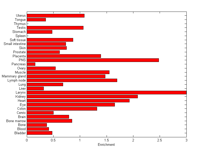 The expression level is normalized with tissue-library size. Each value for a gene in a tissue is a ratio of observed ESTs to the expected one in this tissue. The expected number of ESTs is the product of total ESTs of the gene and the fraction of total ESTs in the tissue among all ESTs in 30 tissues.