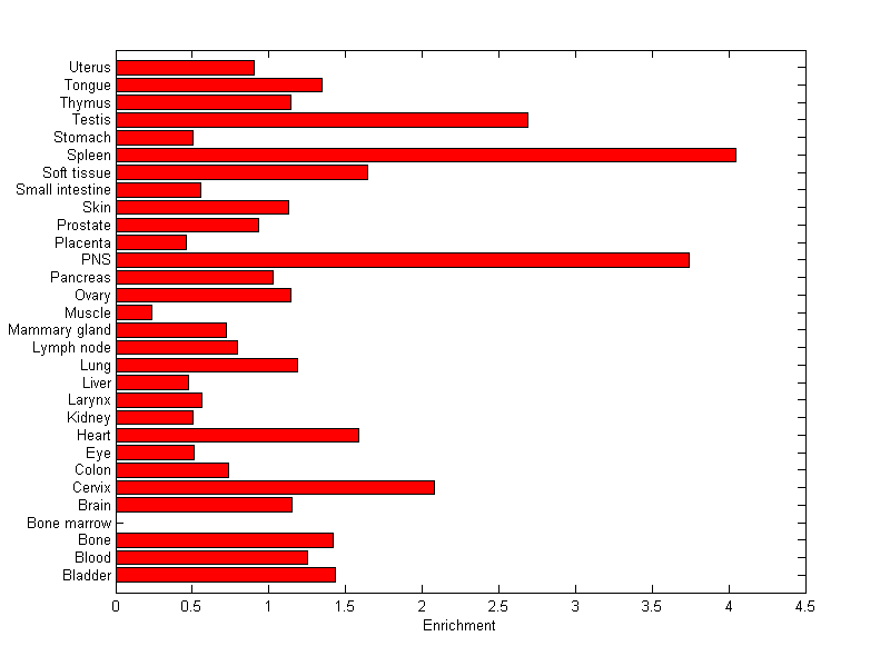 The expression level is normalized with tissue-library size. Each value for a gene in a tissue is a ratio of observed ESTs to the expected one in this tissue. The expected number of ESTs is the product of total ESTs of the gene and the fraction of total ESTs in the tissue among all ESTs in 30 tissues.