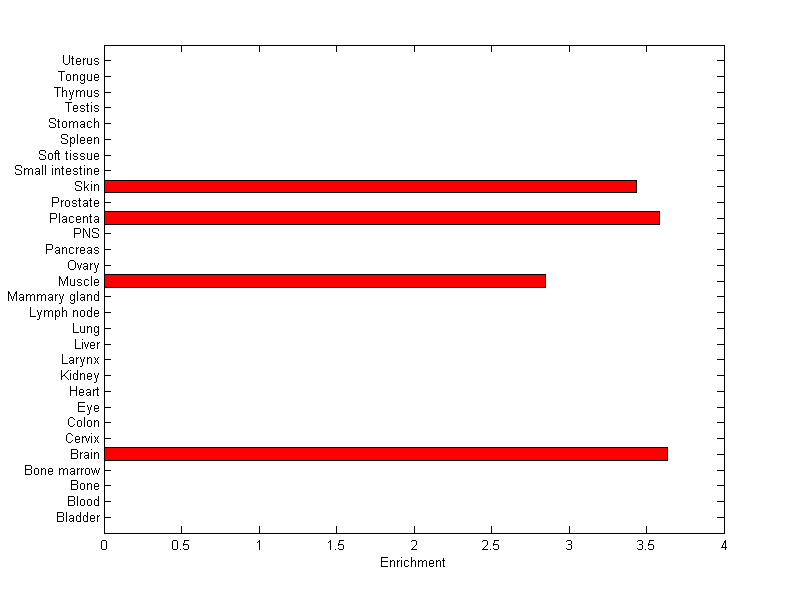 The expression level is normalized with tissue-library size. Each value for a gene in a tissue is a ratio of observed ESTs to the expected one in this tissue. The expected number of ESTs is the product of total ESTs of the gene and the fraction of total ESTs in the tissue among all ESTs in 30 tissues.