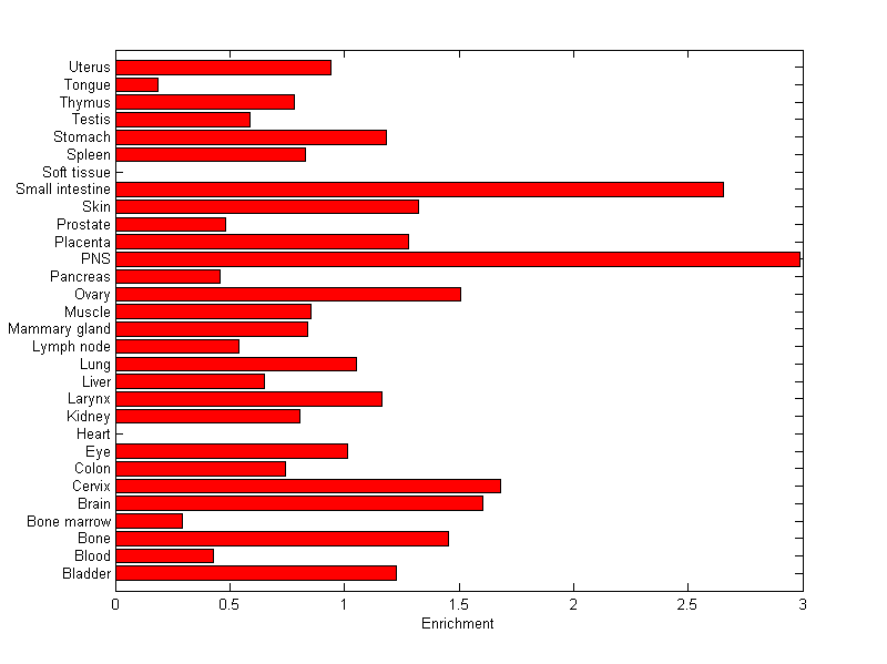 The expression level is normalized with tissue-library size. Each value for a gene in a tissue is a ratio of observed ESTs to the expected one in this tissue. The expected number of ESTs is the product of total ESTs of the gene and the fraction of total ESTs in the tissue among all ESTs in 30 tissues.