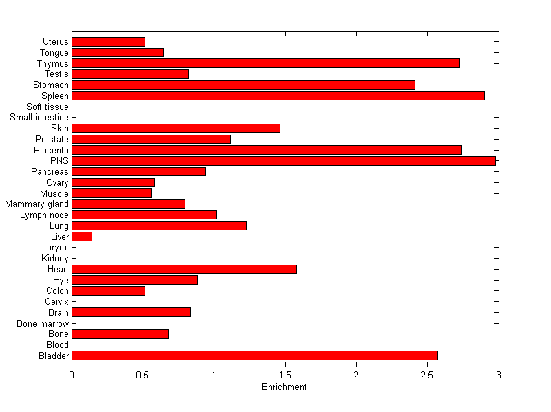 The expression level is normalized with tissue-library size. Each value for a gene in a tissue is a ratio of observed ESTs to the expected one in this tissue. The expected number of ESTs is the product of total ESTs of the gene and the fraction of total ESTs in the tissue among all ESTs in 30 tissues.