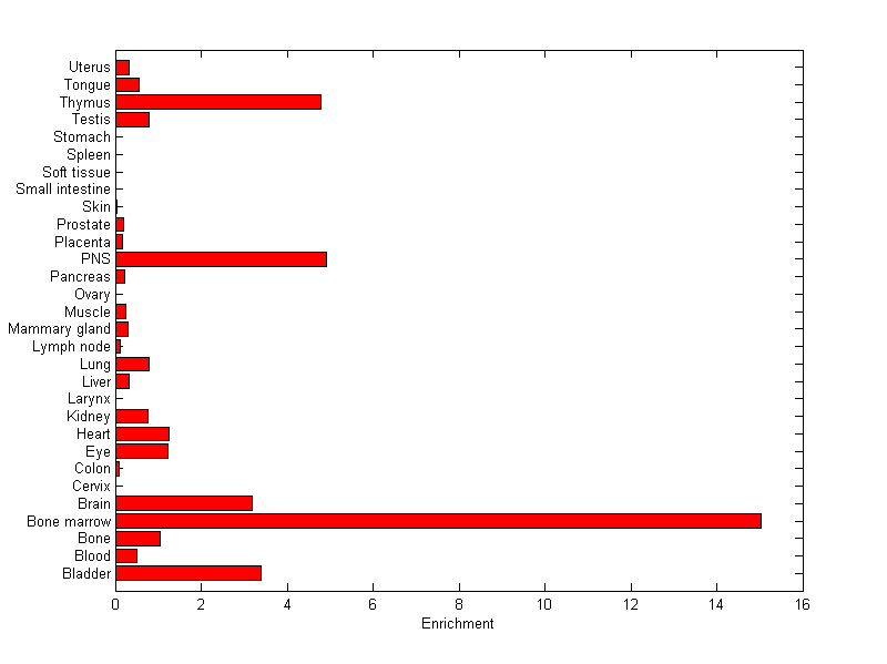 The expression level is normalized with tissue-library size. Each value for a gene in a tissue is a ratio of observed ESTs to the expected one in this tissue. The expected number of ESTs is the product of total ESTs of the gene and the fraction of total ESTs in the tissue among all ESTs in 30 tissues.